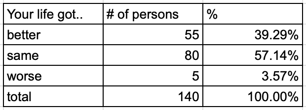 Voici donc un résultat réaliste suite à l’ouverture du portail. Le constat est le suivant : environ 35 % d’entre nous ont vu leur vie s’améliorer, environ 60 % n’ont pas vu leur situation évoluer et environ 5 % ont vu la leur se détériorer.